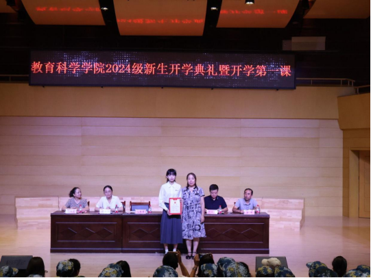 9月9日晚,教育科学学院在华金音乐厅举行2024级新生开学典礼暨开学第一课,学院处科级干部、全体辅导员及2024级新生参加。开学典礼由学院党总支书记李武军主持。