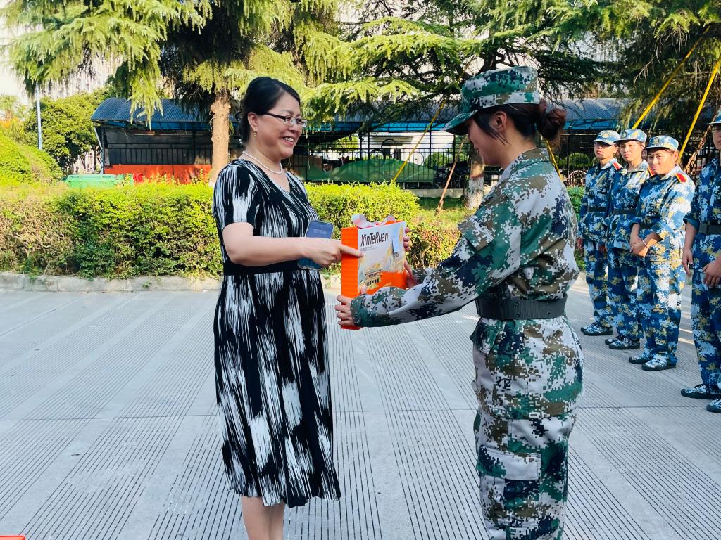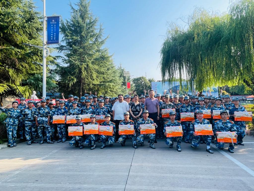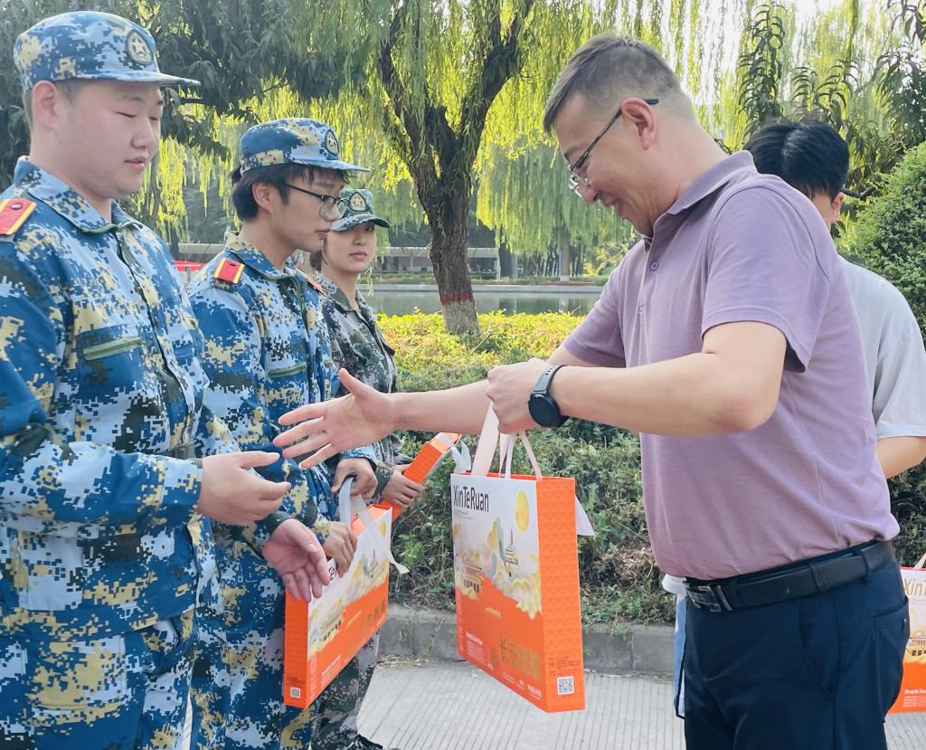 随后,张萍、肖飞一同为辛勤训练的教官及全体新生发放了精心准备的月饼、茶饮等慰问品。