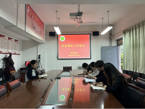9月29日,体育学院召开安全稳定工作会议,传达和落实学校安全稳定会议精神,切实做好“十一假期”安全稳定工作,学院党总支书记李春兰、党总支副书记闵雄飞、学工班主任朱颖妮及全体辅导员参会。