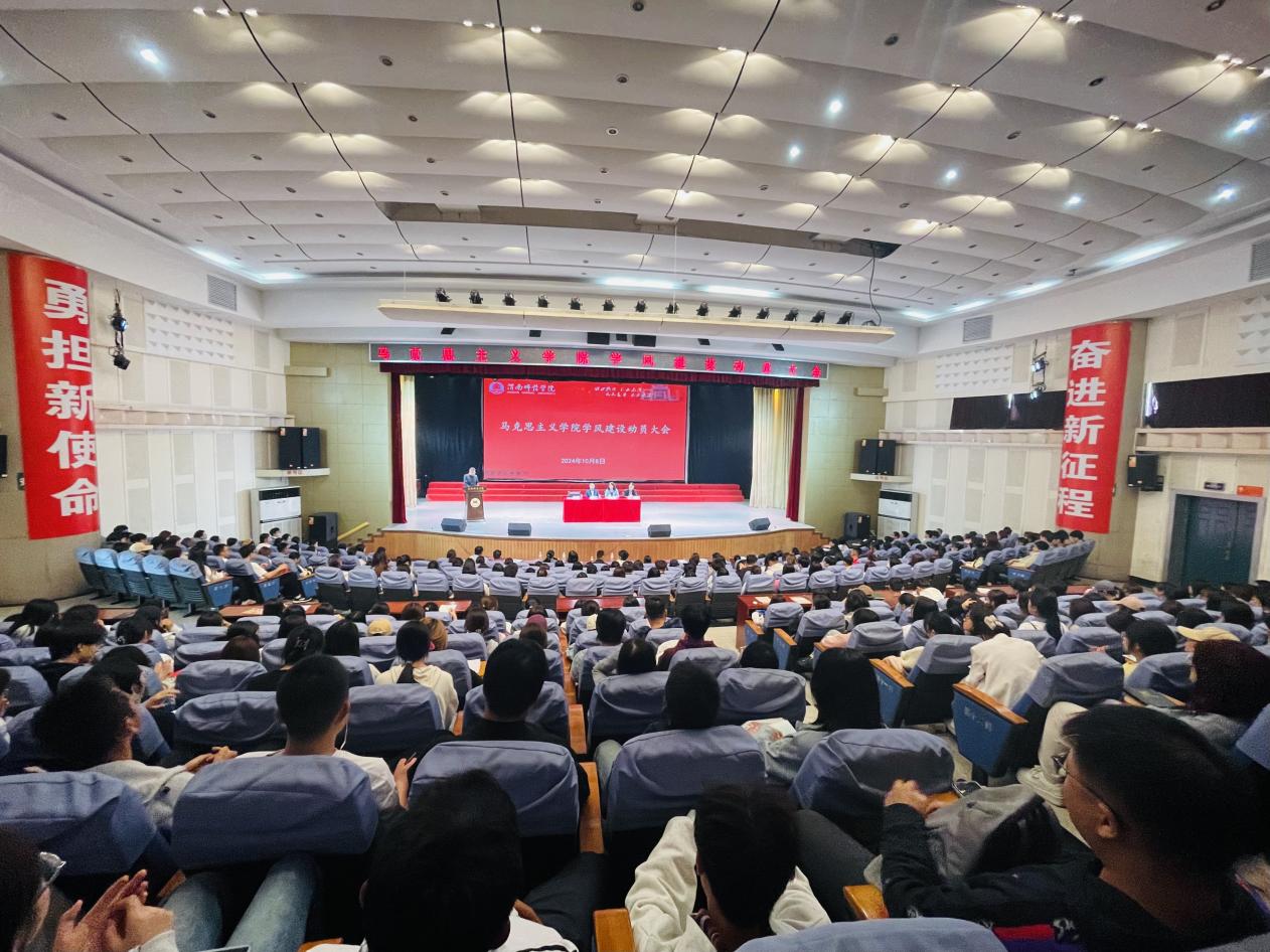 10月8日下午,马克思主义学院在演艺厅召开学风建设动员大会,学院处科级干部、专业负责人、专任教师、辅导员以及2022级、2023级、2024级全体学生参加。大会由党总支副书记肖飞主持。