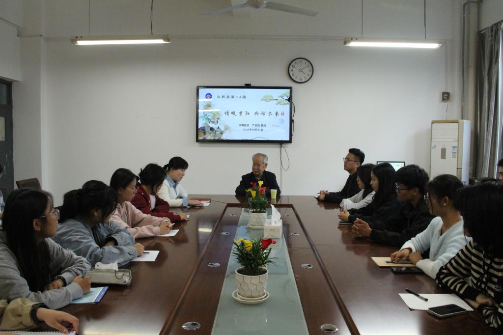 10月11日,恰逢一年一度的重阳佳节,人文学院召开“情暖重阳 共话未来”师生座谈会暨本学期第2期(总第34期)“与析斋”答疑活动,特邀人文学院退休教授、著名红学研究专家严安政教授与学生面对面交流畅谈。院长赵前明,党总支副书记、副院长王昱,全体辅导员及30余名学生参加活动,党总支书记张晶主持座谈会。