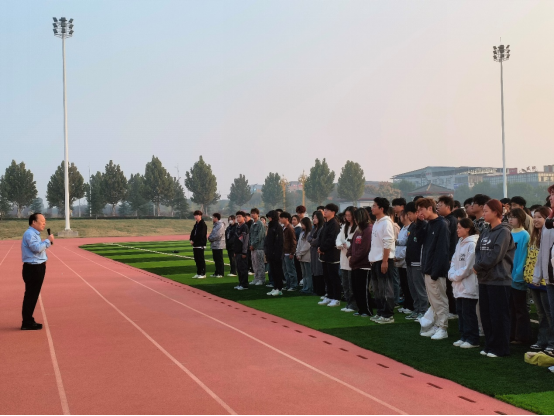 曹熙斌作动员讲话,他引用毛主席《体育之研究》中“野蛮其体魄,文明其精神”的口号,生动阐释锻炼身体、增强体质的重要性。希望同学们继续发扬军训期间优良传统,培养坚韧不拔的意志,增强责任感与使命感,发扬团队精神,认真落实“两早一晚”的要求,养成积极、健康、向上的学习和生活习惯,做一名德智体美劳全面发展的合格大学生。