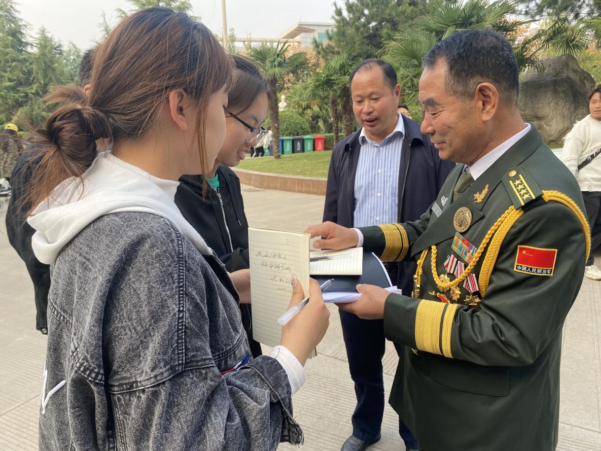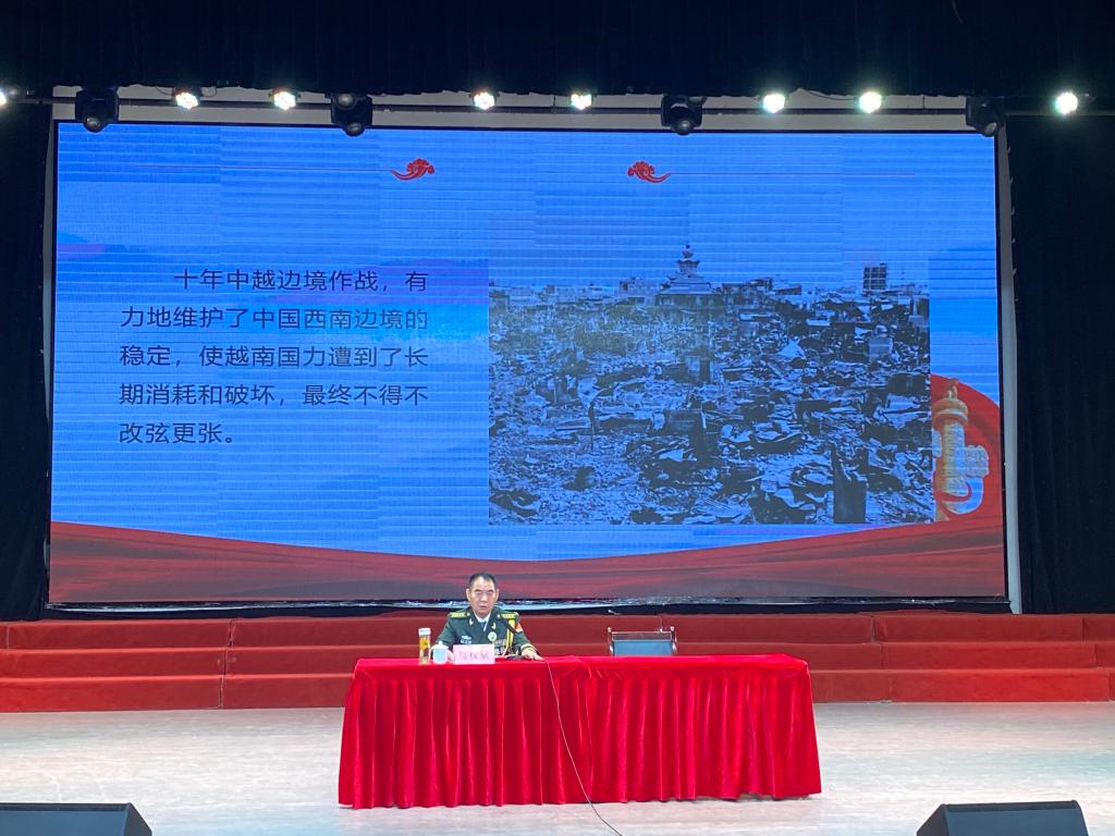 马权斌以《为党和人民奉献牺牲是革命军人最大的荣誉》为题,分享了在对越轮战中的亲身经历以及战斗英烈们的英雄事迹,结合自身经历和国际形势指出,作为军人,面对国家和人民的利益受到侵害,就应带头听从党的召唤,挺身而出,义无反顾;面对艰难残酷的战争环境,就要带头发扬大无畏的革命精神,敢于牺牲,乐于奉献;面对功名考验,就要带头淡泊名利,视功名如鸿毛,视责任如泰山。希望广大青年学生关心国防、热爱国防、建设国防。感人至深的故事、令人震撼的场景、淡雅泛黄的照片生动再现了忠诚、无私、奉献、无畏的使命担当,报告感情真挚、内涵丰富,逻辑严密、说理透彻,赢得了在场师生的阵阵掌声。
