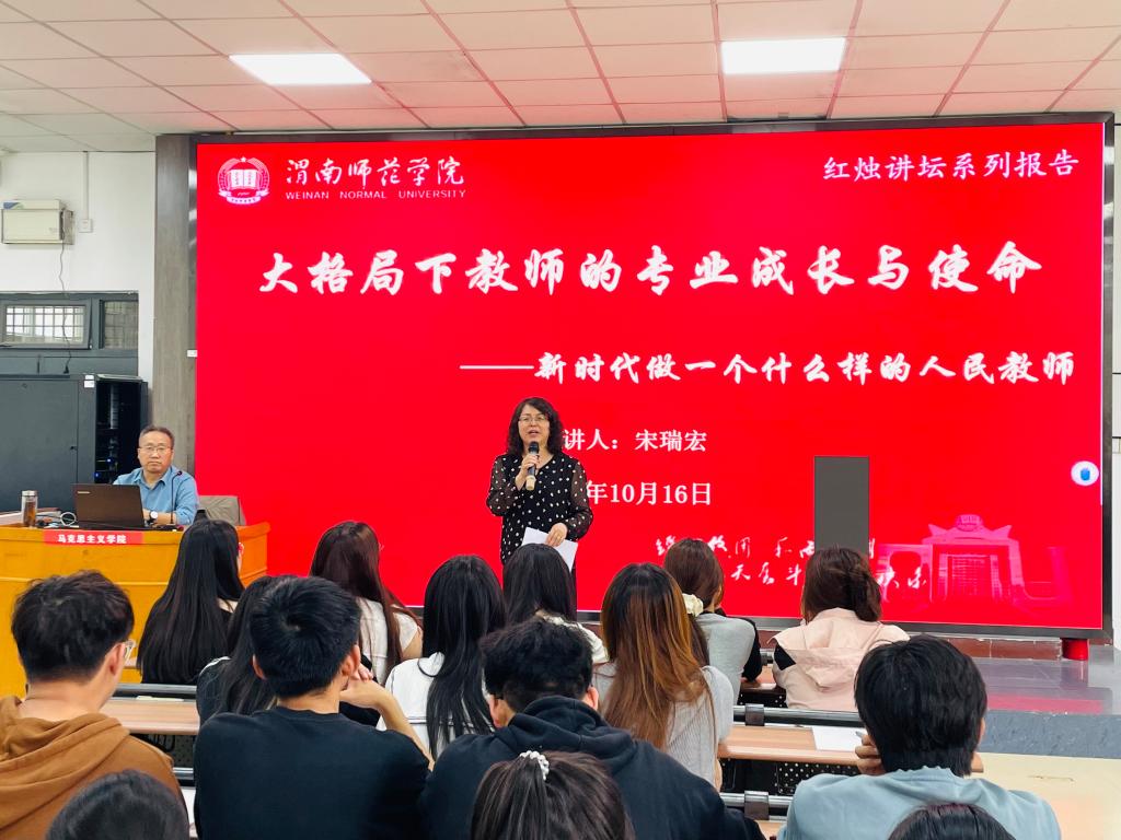 10月16日下午,马克思主义学院邀请陕西三秦英才特支计划教学领军人才、陕西省特级教师、陕西省教学名师宋瑞宏在1101教室作了题为《新时代教师的专业成长与使命担当》的专题报告。马克思主义学院院长张萍、教师代表李昊婧及2023级思想政治教育专业学生参加。报告会由张萍院长主持。
