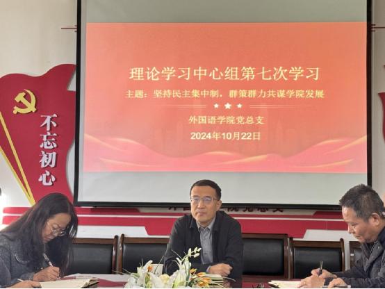 10月22日上午,外国语学院党总支召开第7次理论学习中心组会议,校党委委员、副校长曹强参加,学院处科级干部、辅导员参会。会议由党总支书记吕健主持。