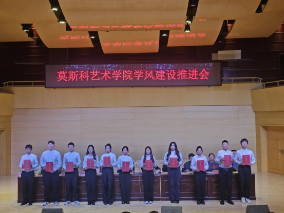 党总支副书记叶晓燕宣读《莫斯科艺术学院2024年学风建设实施方案》。副院长高红菊就教学和学风建设提出具体要求。副院长梁卫民宣读莫斯科艺术学院班主任名单。学工办副主任段菲宣读《“两早一晚”实施方案》。外事秘书韦宁宁宣读《莫斯科艺术学院关于表彰2023-2024学年学风建设先进个人的决定》。随后,学生代表张倩钰表态发言。