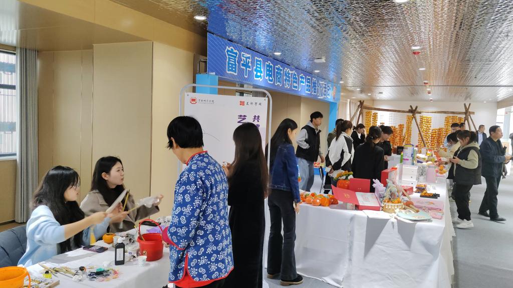 美术学院师生以绘画富平区域特产与直播富平县域特色农产品的形式参加,并为该活动绘制的“柿柿平安”“岁岁年年柿柿红”等作品,获得了与会代表们的赞扬与肯定。美术学院对该活动以全程直播,直观宣传展示了渭南区域和富平县特色产品,如特色纺织品、脆柿、尖柿、酸奶、羊奶粉、琼锅糖等特色产品。