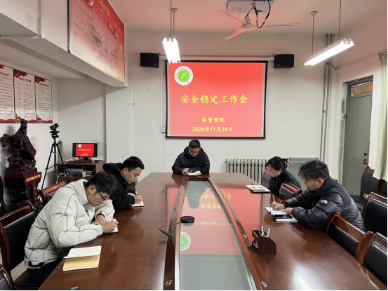 11月20日,体育学院召开学生工作安全稳定专题会议,党总支副书记闵雄飞、学工办主任朱颖妮、辅导员胡晋豫以及学生会主席团的成员参加会议。