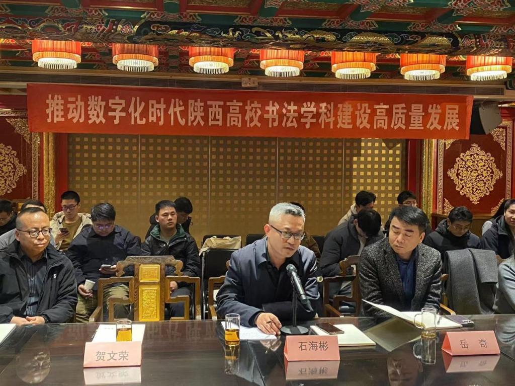 当天,来自陕西十所高校的近50名书法学专业教师齐聚一堂,会议以“发挥资源优势,加强合作交流,推动数字化时代陕西高校书法学科建设高质量发展”为主题,围绕书法学科设立的现实意义、使命担当与未来发展动向、研究生教育与培养、美术与书法专业硕士学位申报对书法学专业毕业生就业,以及人工智能时代,数字化如何赋能书法学专业教学以及书法学专业与其他相关专业的融合发展问题、书法学专业师范认证问题、如何利用陕西丰厚的文化资源进行特色发展等问题,各院校专业负责人展开热烈的发言讨论。