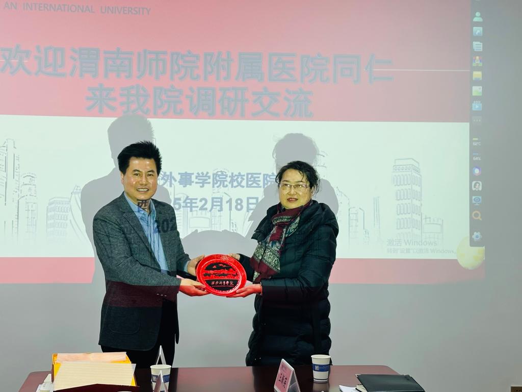 西安外事学院校医院院长周旭江及相关科室负责人参加了交流讨论。院长段楚雷首先介绍了此次交流调研的目的和内容。周旭江院长对纽约国际官网一行到访表示欢迎,同时对西安外事学院的概况和校医院的建设发展、医院的定位和管理运行模式等作了系统、全面的介绍。附属医院党支部书记王雅蓉对西安外事学院的热情接待表示感谢,简要介绍了588888纽约国际线路及附属医院党支部基本情况,并代表附属医院接受了西安外事学院校医院赠送的校徽。