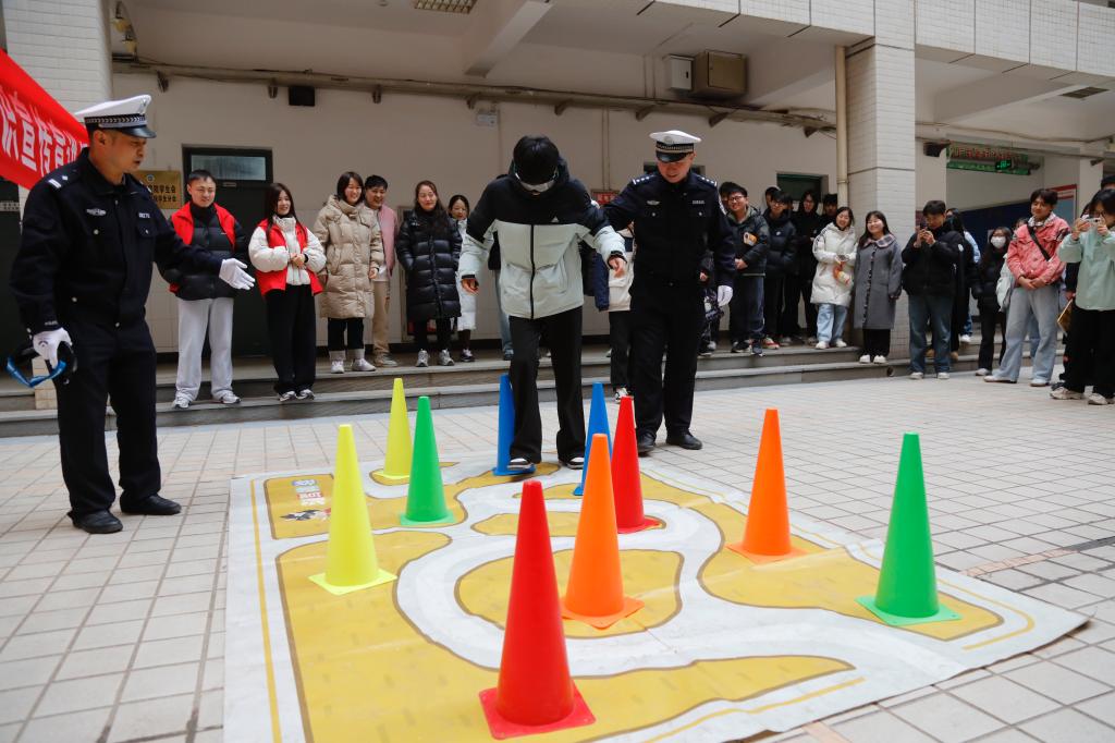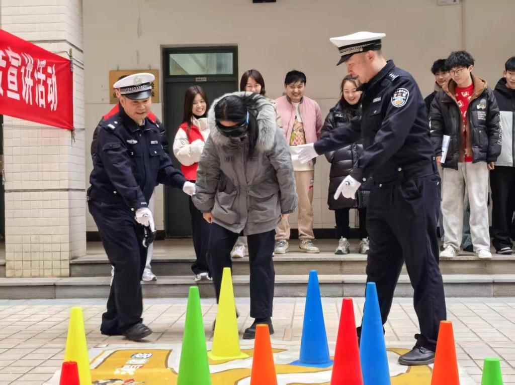 随后,艾警官与苗警官深入细致地讲解了交通安全法律法规,结合实际案例,生动阐述了常见交通违法行为的严重危害。为了让师生们有更直观的感受,两位警官现场展示了标准的交通指挥手势,详细介绍各类交通标志的含义;还准备了酒驾模拟眼镜,让师生们亲身模拟酒驾体验;更别出心裁地用蛋黄派、红牛、果酒、黄桃罐头等常见食品饮品,通过酒驾测试棒进行现场测试,直观呈现食用某些食品后可能导致的酒驾误判情况。