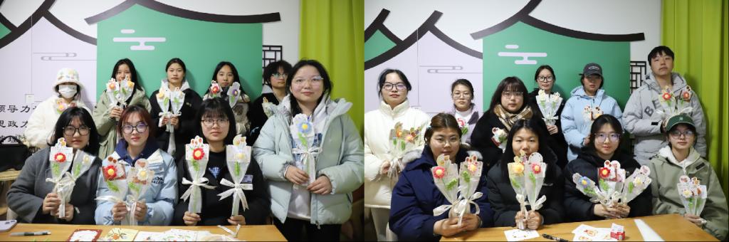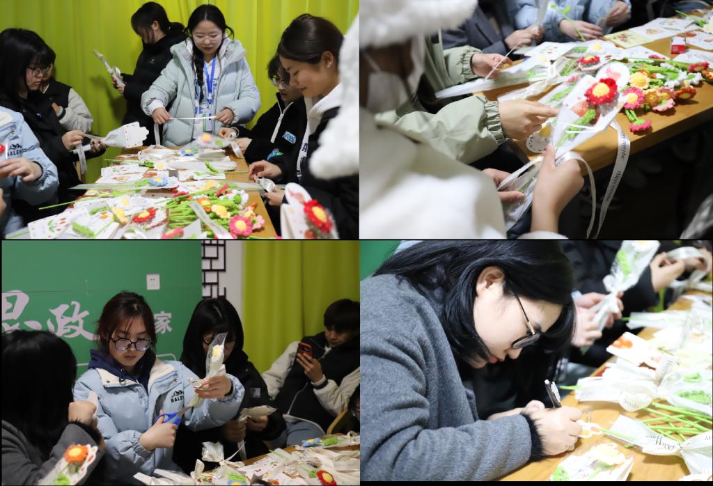 活动前夕,学院在10B学生社区举办了一场创意手工花制作活动。同学们用彩色毛线、精美贺卡和纤细铁丝,巧手制作出表达爱意的独特花朵,并亲手写下对老师的祝福。大家围坐交流技巧,分享女老师的暖心故事,现场欢声笑语。从花瓣卷曲到花蕊制作,再到细致组装,每一步都蕴含深情。