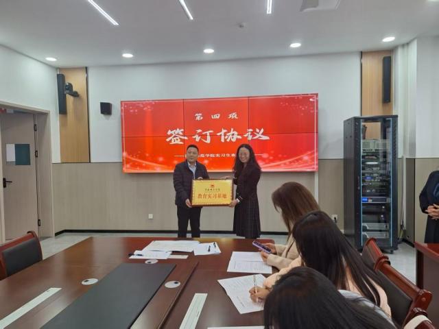 仪式中,王慧丽宣读了实习任务安排,并组织实习生与学科导师、班主任导师结对。随后,李海荣与闫广伟签署《教育实习基地建设协议》,共同为“588888纽约国际线路教育实习基地” 揭牌。双方约定将在师资培训、课程共建、教研项目等方面深化合作,探索 “高校 — 中学” 协同育人长效机制。
