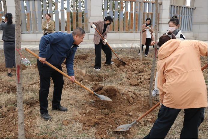 仪式结束后,全体学员与继续教育学院教职工前往富平校区共同开展“聚培训能量 植成长之树为教育添绿”主题植树活动。学院教工与学员们挥锹铲土、扶苗浇水,亲手种下象征希望与成长的国槐树苗。经过两小时协作,116余株新绿昂然挺立,每棵树苗挂上了专属“成长牌”,记录下学员们的寄语与期许。