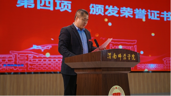周德锋宣读优秀新生表彰决定。与会领导为高等学历继续教育授课教师代表颁发聘书、为优秀新生代表颁发荣誉证书并佩戴校徽。