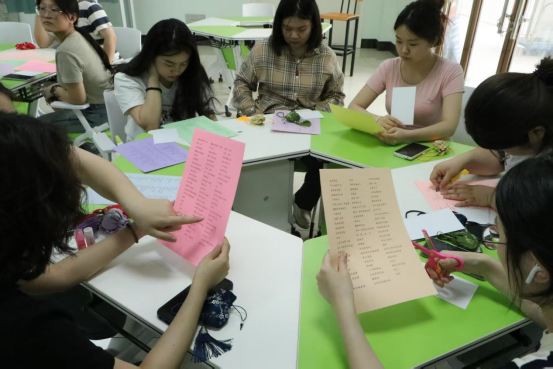 古法养生锤凝聚身心能量。活动中学生们亲手制作棉布锤包,填充艾草等天然材料,并在锤柄缠绕彩线以寄托祝福。随着养生锤的反复捶打,艾草清香弥漫全场,参与者们在捶肩、敲背的互动中体验身体放松与情绪舒缓。同学们表示:“原本焦虑的心情在专注裁剪、缠绕的过程中渐渐平静,完成作品时仿佛也整理好了自己的情绪。”“自己动手制作的过程让我感受到‘慢下来’的力量,艾草香气也让人格外安心。”