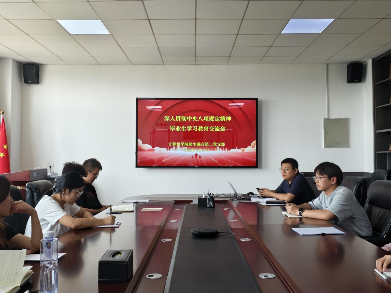 5月21日下午,计算机学院师生融合第二党支部在同心楼5406会议室开展深入贯彻中央八项规定精神毕业生学习教育交流会,师生融合第二党支部书记薛飞及毕业班党员30余人参加,会议由薛飞主持。