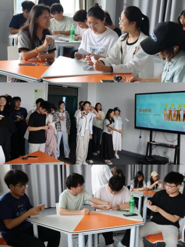 在破冰环节中,学生通过纸飞机随机分组后,以数字猜谜竞赛强化思维协作,并通过互动按摩肩膀放松营造轻松氛围,快速建立团队默契。