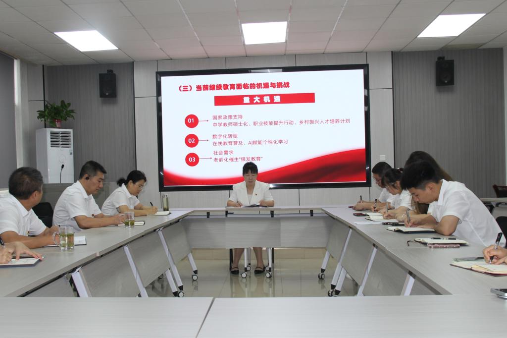 张晶从理论指引、实践路径、使命担当三个维度展开讲授。她指出,新时代继续教育已从传统的学历补偿和技能培训,发展成为党联系群众、服务社会的重要纽带。面对产业升级和人口结构变化带来的新需求,学院要立足学校特色,着力构建“学历教育+职业培训+社会服务”三位一体的办学新格局。