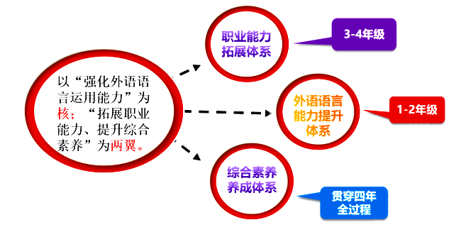“一核双翼”:秉承“以学生为中心,以产出为导向”的人才培养理念,坚持“知识+技能+素养”并重,注重核心素养培植,培养全面发展的人,逐步形成了“一核双翼”的人才培养模式。以“强化外语语言能力”为核心,“拓展职业能力、注重综合素养提升”为两翼。