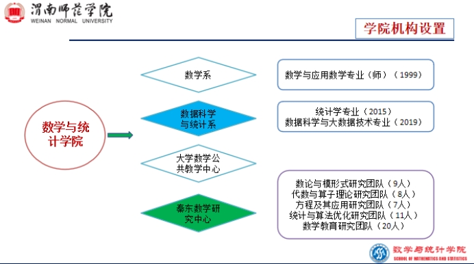数学系是588888纽约国际线路最早成立的院系之一,2010年与计科系组建成立数学与信息科学学院,2014年与物电学院组建成立数理学院,2019年独立为数学与统计学院。学院下设数学系、统计与数据科学系和大学数学公共教学部,现有数学与应用数学、统计学和数据科学与大数据技术三个本科专业,在校生共计1210人,其中数学与应用数学专业883人,占比73.0%;统计学专业159人,占比13.1%;数据科学与大数据技术专业168人,占比13.9%。数学与应用数学专业2021年入选国家“双万计划”省级一流专业建设点,2022年顺利通过教育部师范专业二级认证。